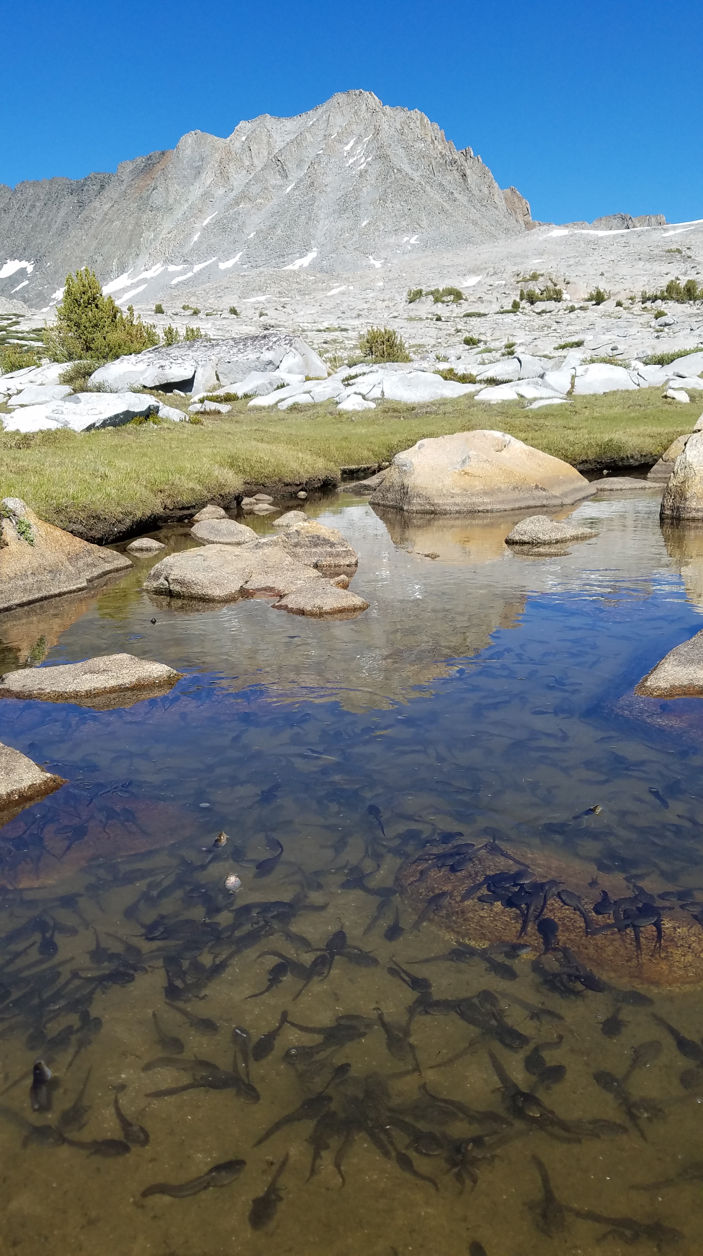 The Sierra Nevada are another example of an epizootic outbreak region. This montane ecosystem in California is characterized by low amphibian diversity (dominated by three species) and high historical amphibian abundance. Unlike Panama where Bd spread rapidly, Bd is thought to have arrived to this region in the last 70 years and has spread slowly. Several species, including Mountain Yellow-Legged Frogs (Rana muscosa & R. sierrae), have been decimated by Bd and are listed as ‘endangered’ under the U.S. Endangered Species Act. Climate change and non-native predatory fish are additional threats.